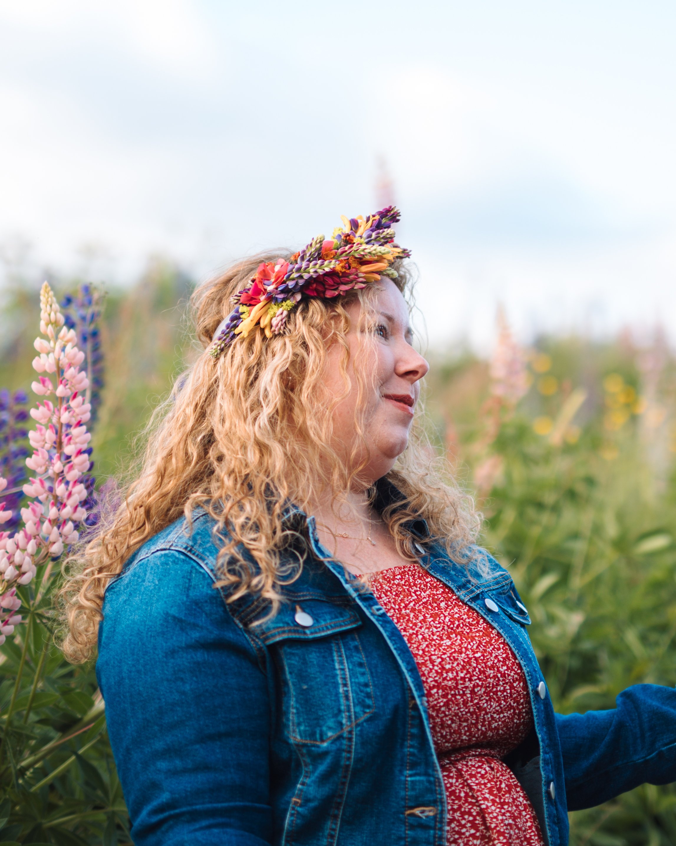 Local florist Christina Hamilton Flowers made the exquisite crown from freshly picked lupins, the perfect accessory for this golden evening by the river.